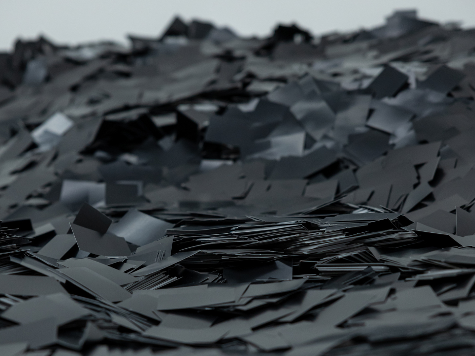 An underfoot monument, blacked-out name cards multiply to engulf the floor, introducing both texture and instability, even as its title fills the viewer with an overpowering sense of finality and the existential weight of unrealised connections.