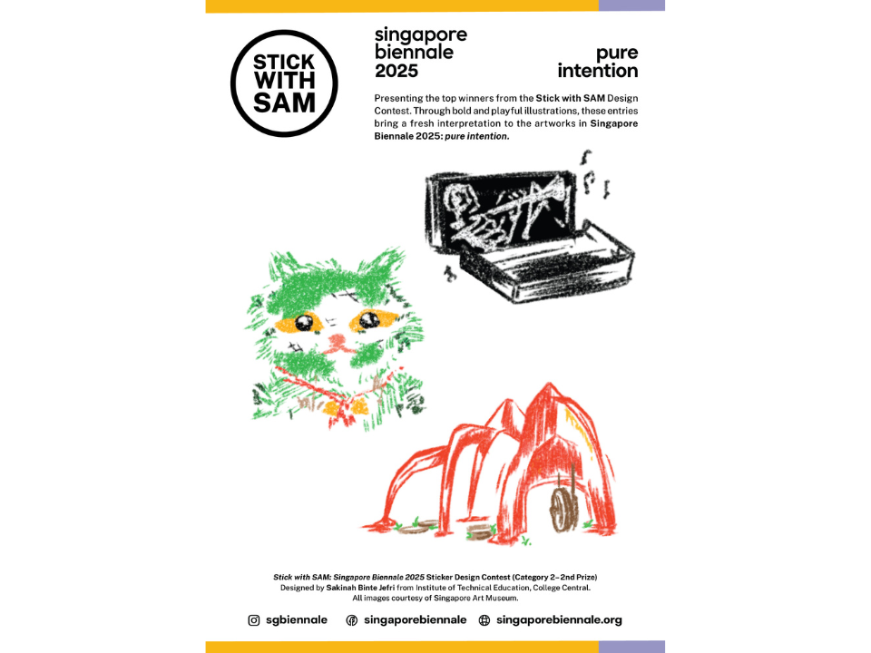 The Stick with SAM Design Competition is back for a special edition celebrating the Singapore Biennale 2025: pure intention. We are excited to invite youth and students aged 10 – 25 to showcase their creativity through sticker designs inspired by artworks from the Singapore Biennale!