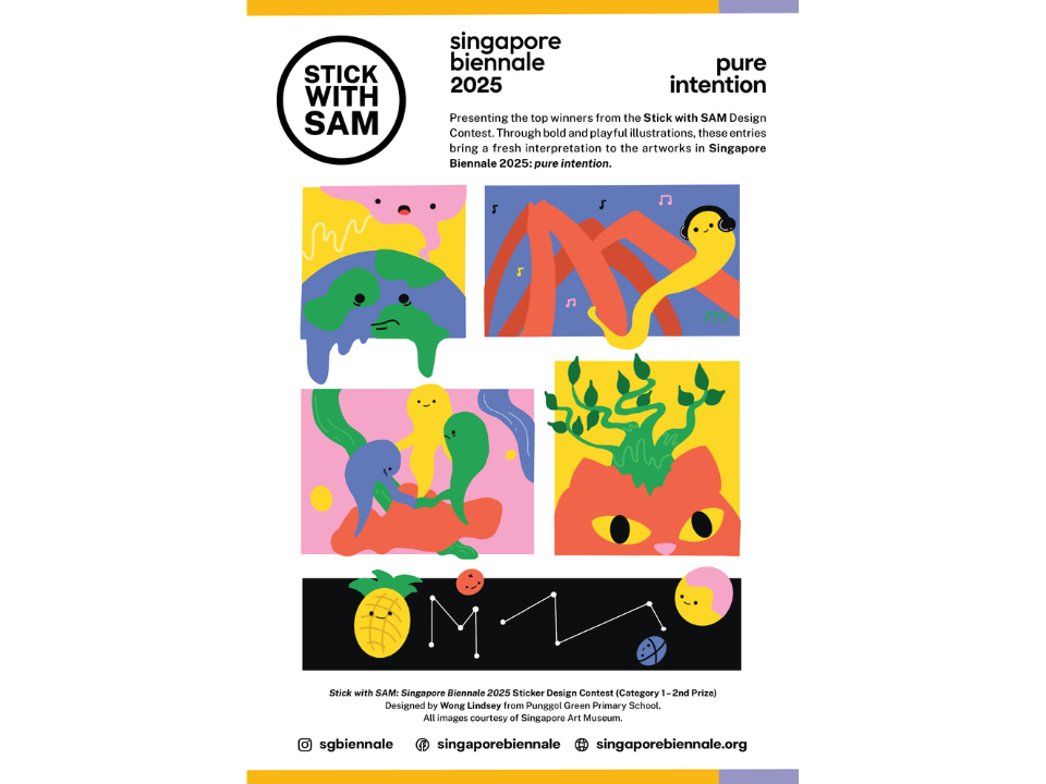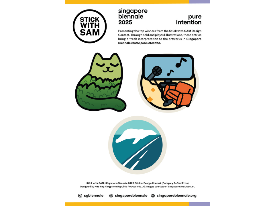 The Stick with SAM Design Competition is back for a special edition celebrating the Singapore Biennale 2025: pure intention. We are excited to invite youth and students aged 10 – 25 to showcase their creativity through sticker designs inspired by artworks from the Singapore Biennale!