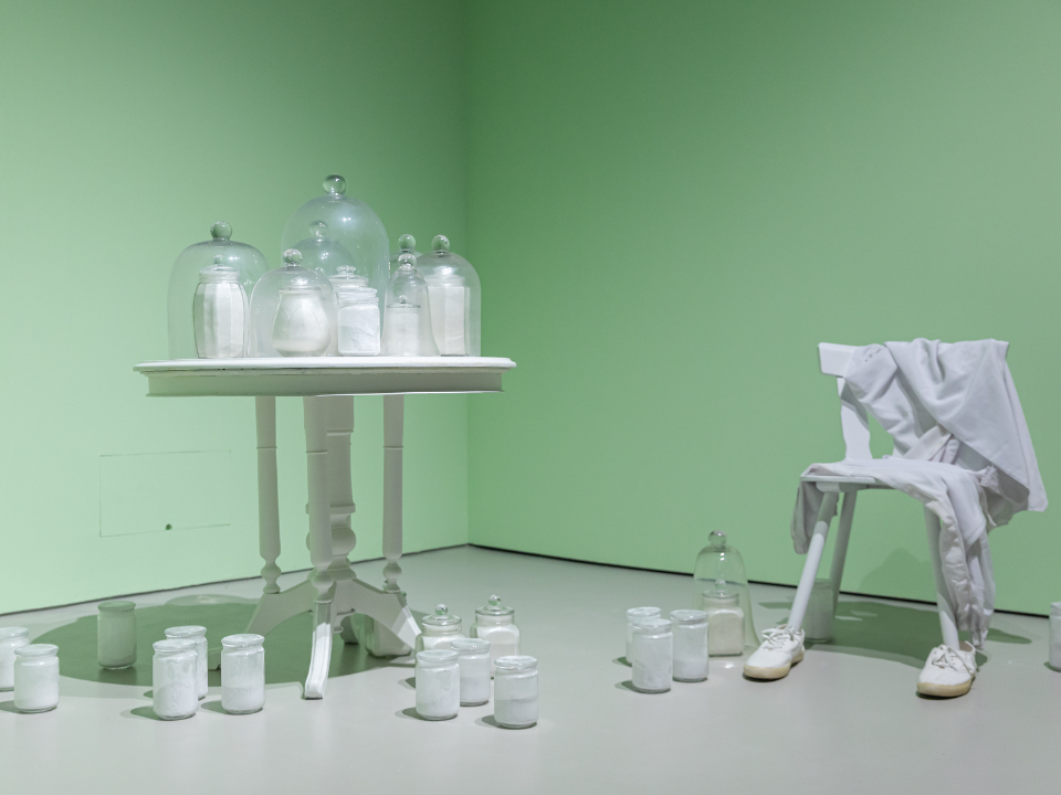 Performative installation with talcum powder, second-hand furniture and glass bell jars; Dimensions variable; Collection of Singapore Art Museum